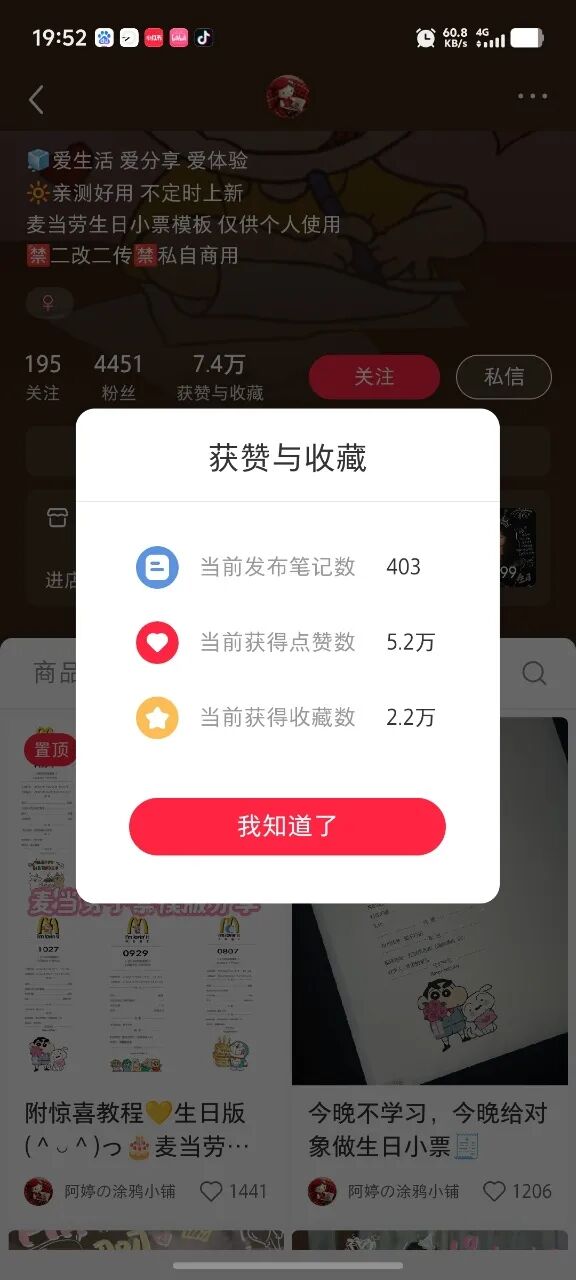 她的小红书账号发了403篇笔记,点赞量5.2万,收藏量2.2万,粉丝虽然只有4451个,但转化率特别高!