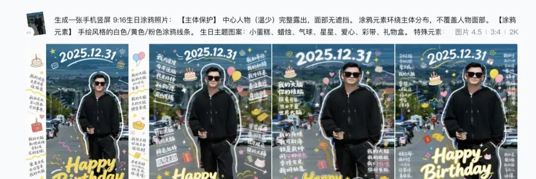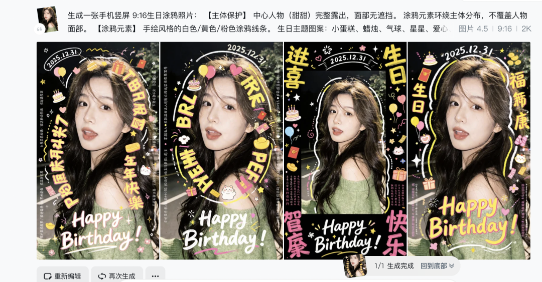 我用上面的提示词,生成了4张图片,那我就用其中一张图作为素材,再输入我们的生日涂鸦效果的提示词就可以了,效果如下: